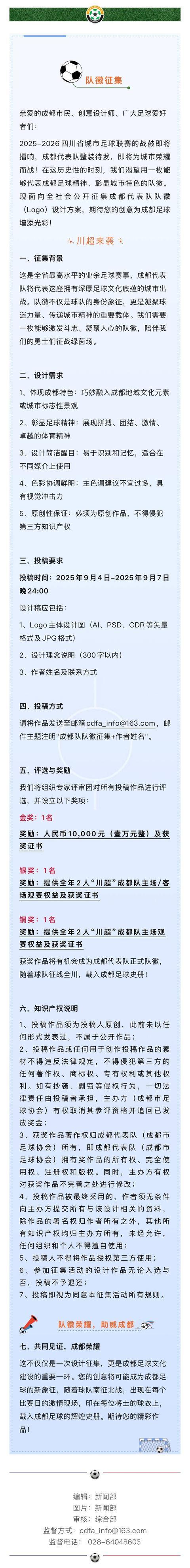 根据成都足协公布的设计需求,队徽要体现成都特色、彰显足球精神,同时设计简洁醒目、色彩协调鲜明,还要保证原创性。投稿时间为2025年9月4日-2025年9月7日24:00。